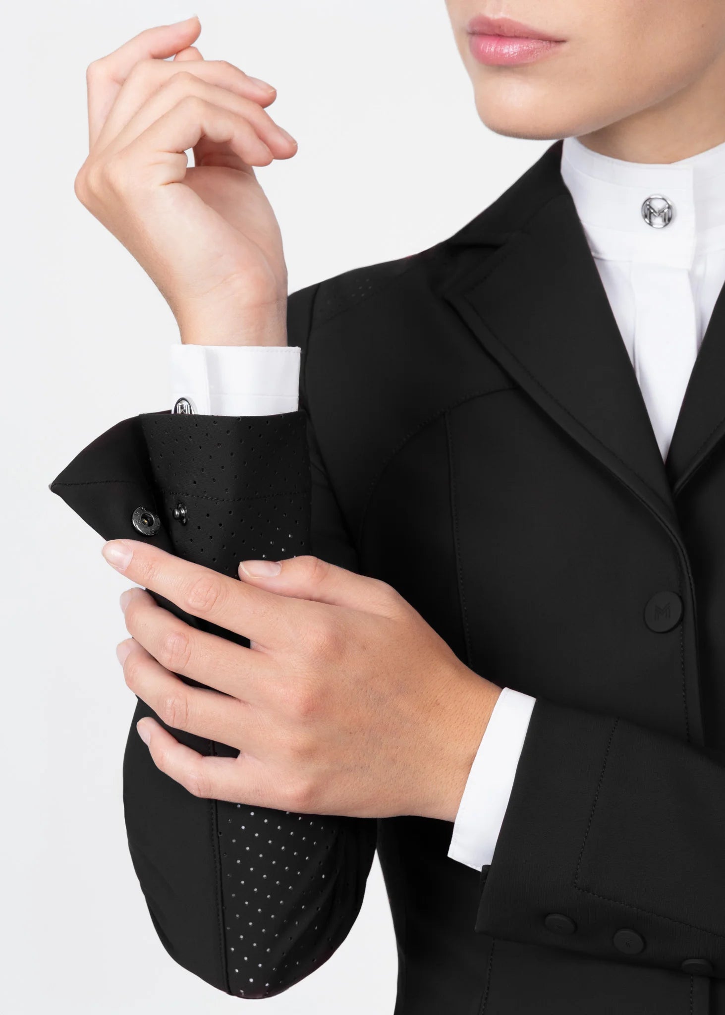 - Removable metallic logo pin on the collar flap, which can be easily repositioned anywhere on the jacket for a personalized look. It can even be worn on the plastron for dressage riders.