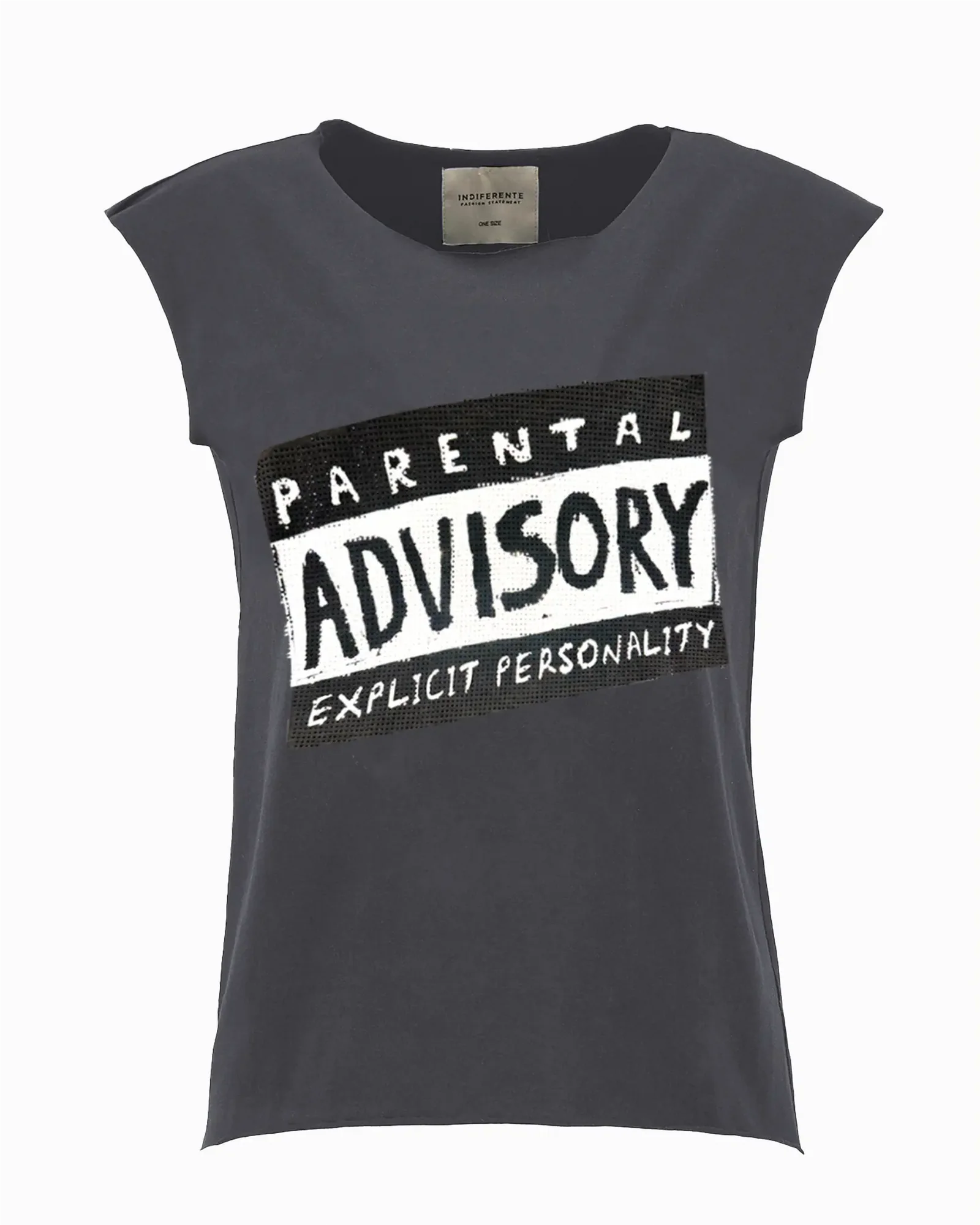 Playera de algodón pima peruano suave y dura toda la vida. Tiene un gráfico de "Parental advisory, explicit personality" (Aviso parental: personalidad explicita) decorado con pedrería que aporta textura y brillo a la playera.
