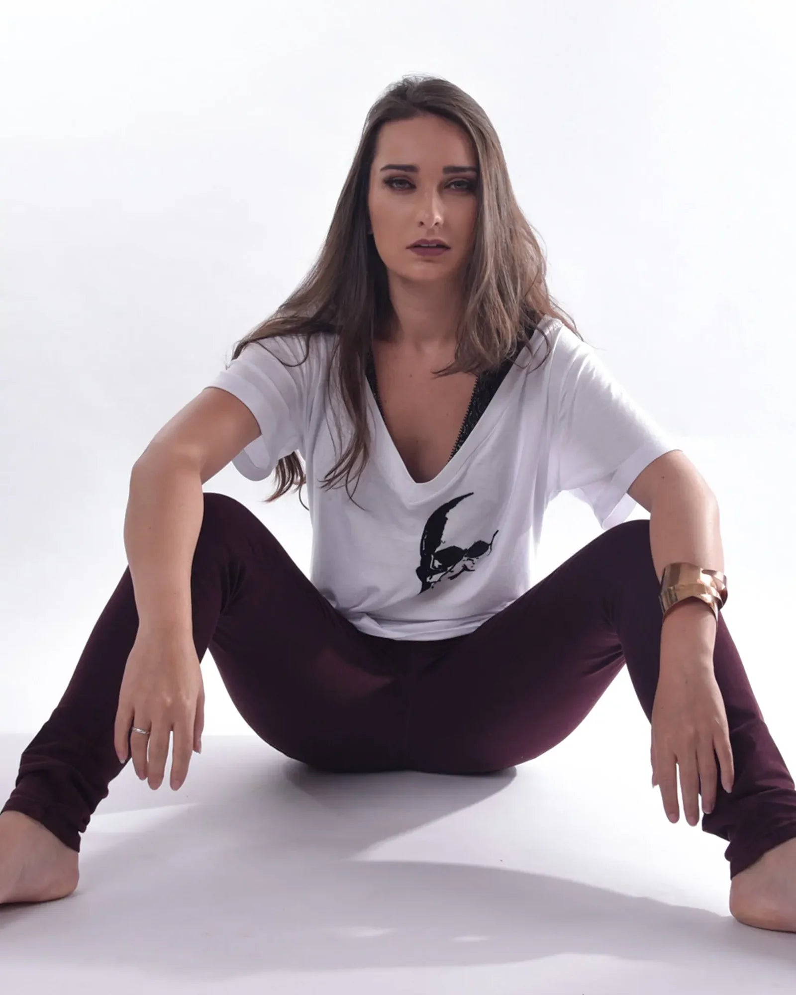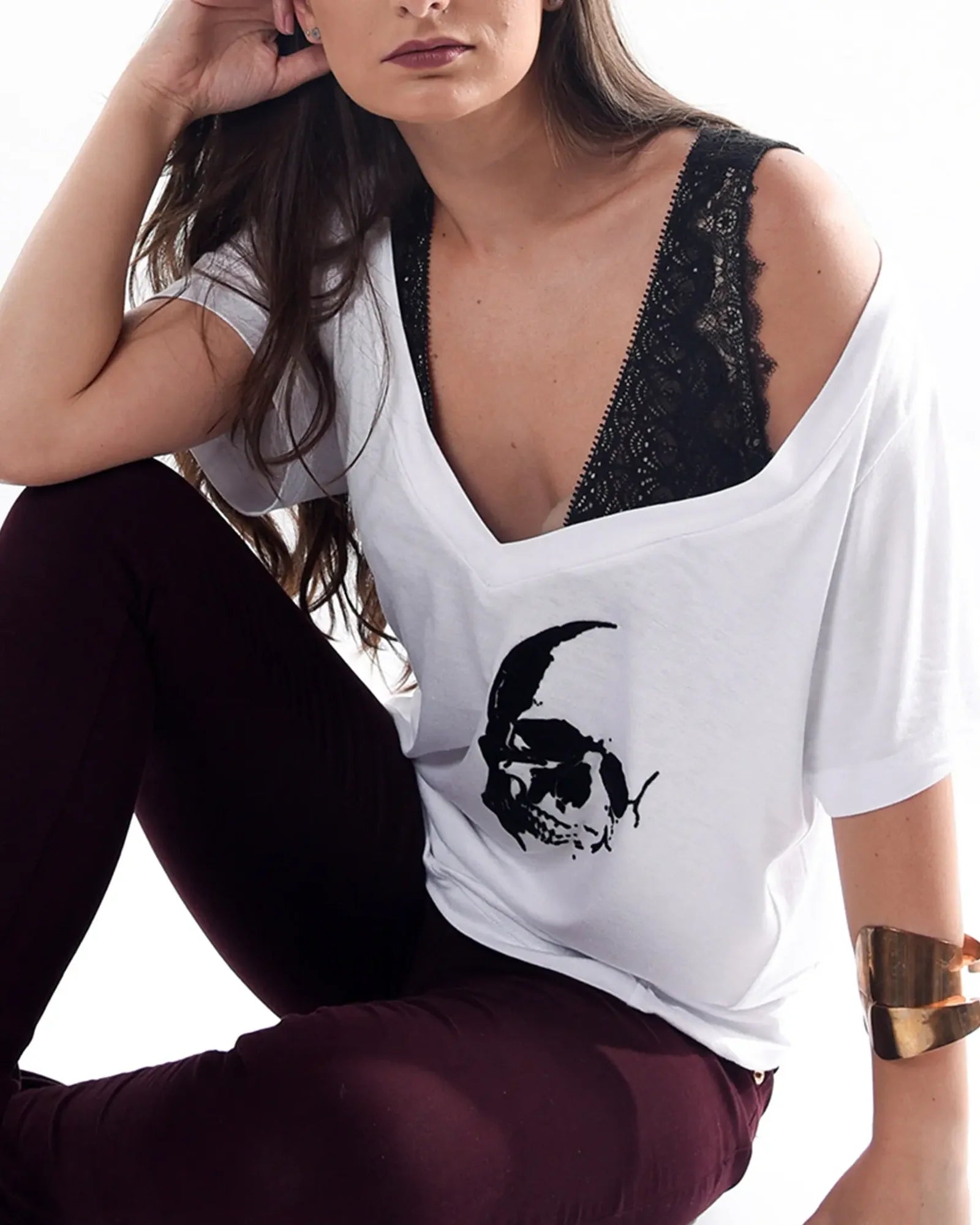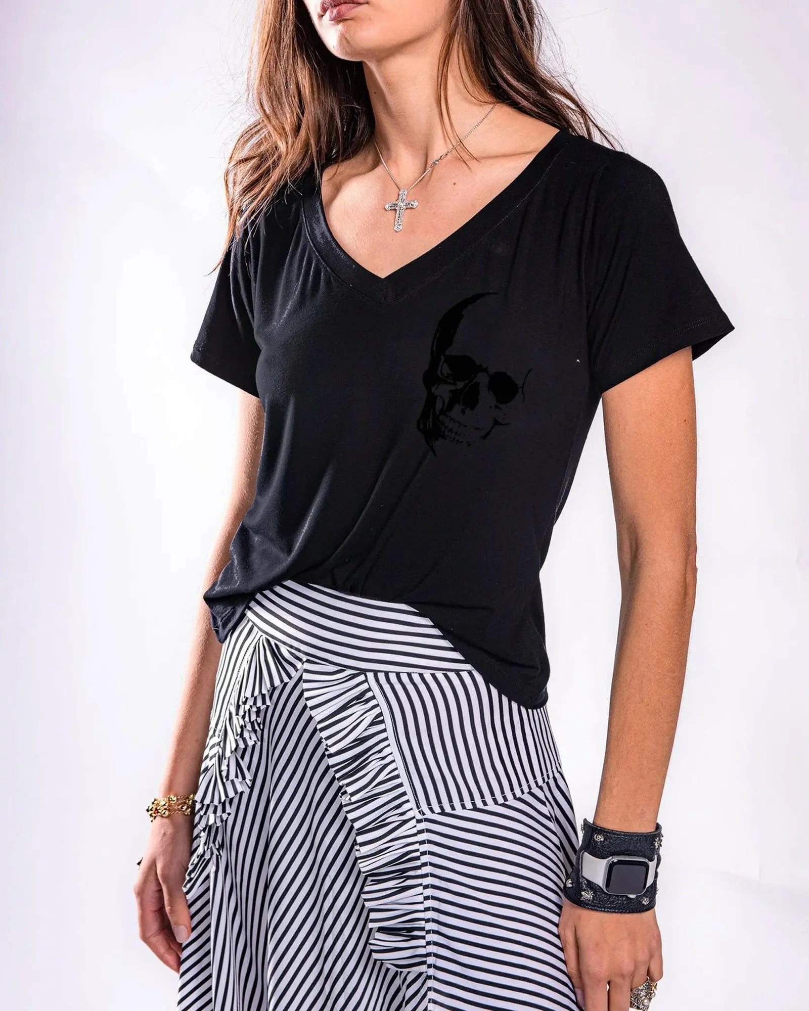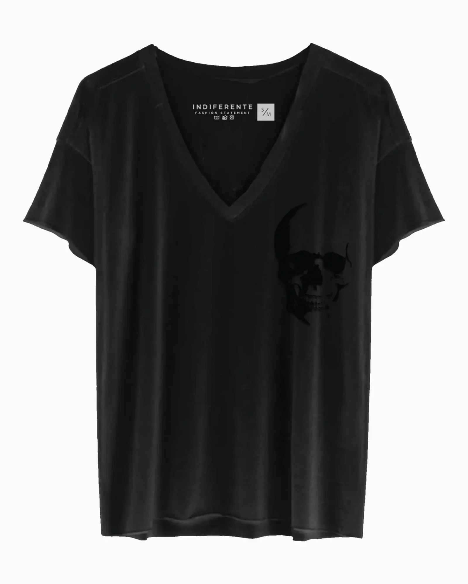 Playera negra con cuello V amplio y fit relajado. El estampado de calavera estilo escudo en terciopelo negro sobre negro añade textura y un look rockero, mientras que su tela ultra suave garantiza toda la comodidad.