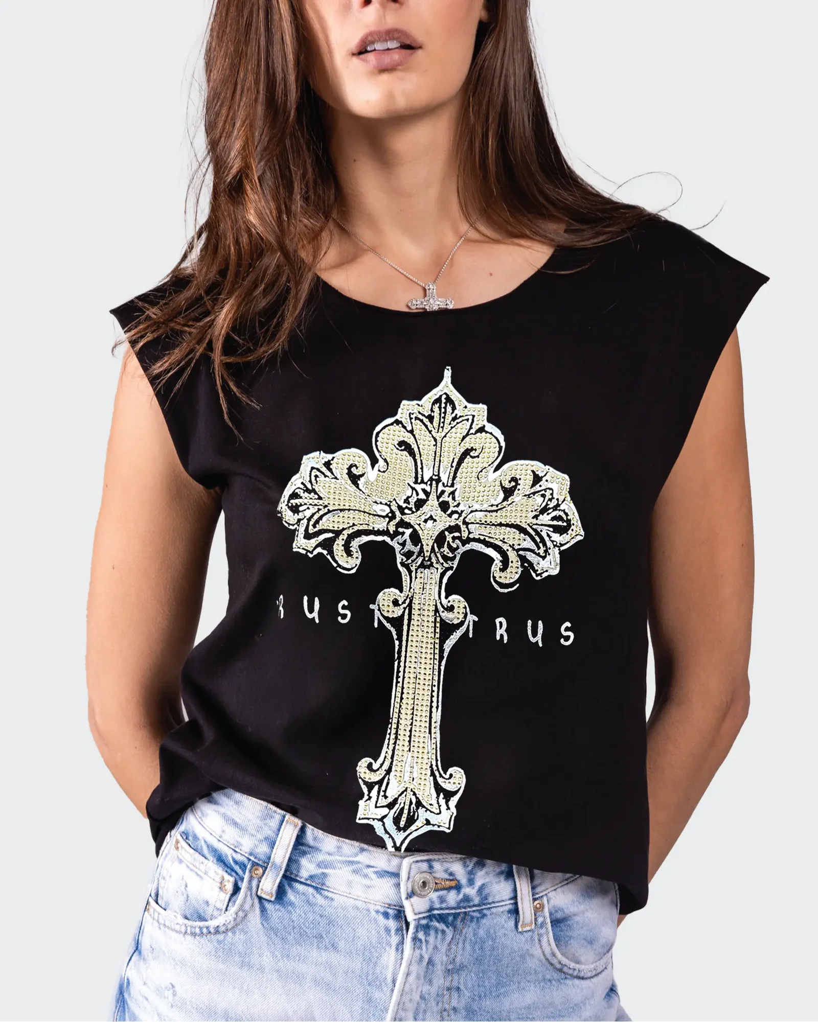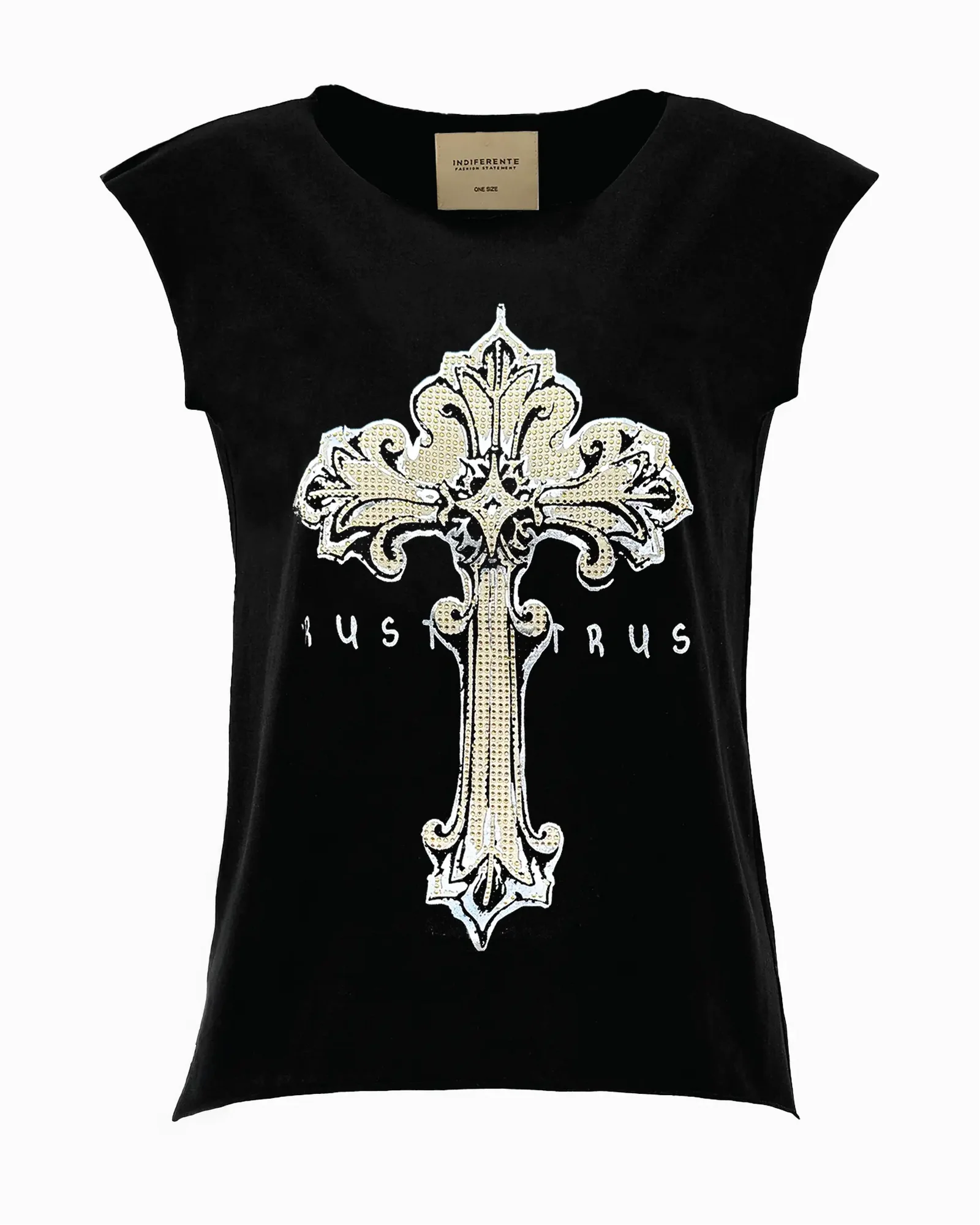 Cruz de estilo clásico con la palabra “Trust”. Prenda de algodón pima peruano, resistente y suave al tacto. Corte amplio que conserva estructura. Detalles con pedrería hecha a mano resaltan el gráfico. Diseño limpio, impacto seguro.